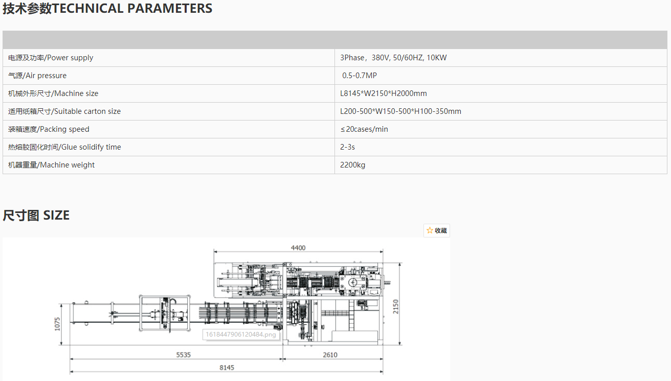 5.常用于饮料、乳品、调味品、日化用品等生产线的配套设备,完成生产后道的装箱工序。